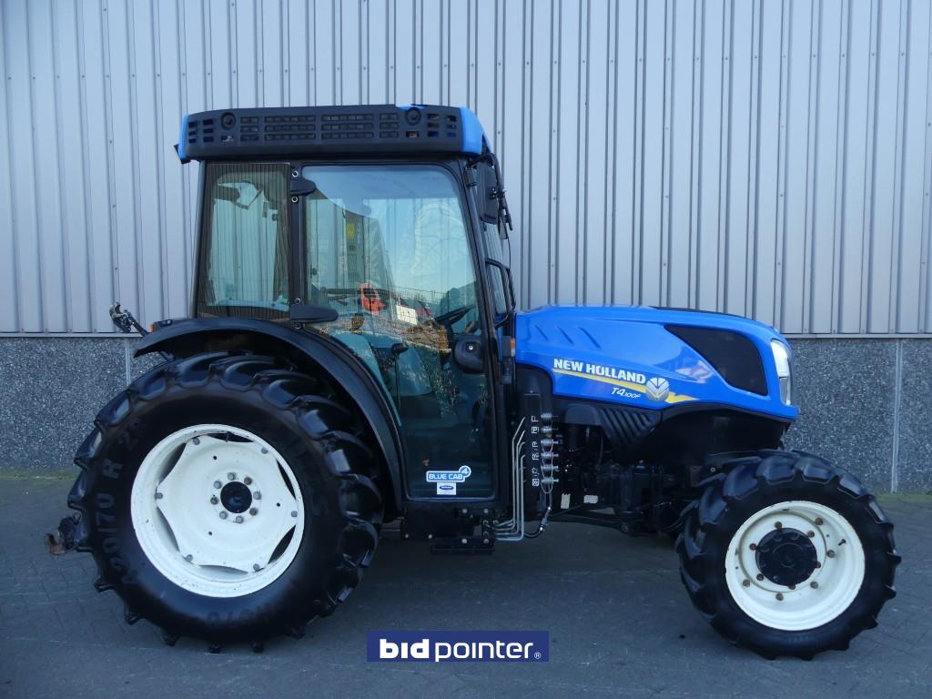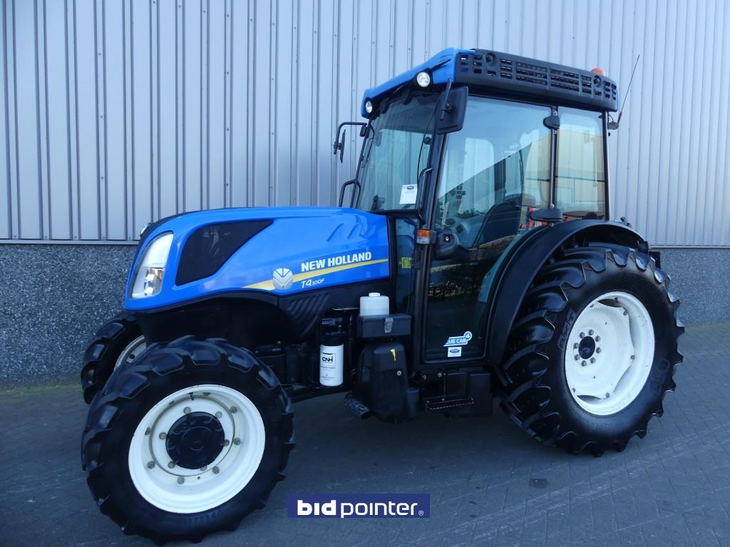 For sale via Bidpointer auctions 2018 New Holland T4.100F Blue cab4, 4103 hours, 40 Km/H, Front lift, Supersteer, pto, Towbar, Top linkage, Front tires 280/70R20 Rear tires 420/70R28, 4 Double-acting & 2 pressure release return valves front and rear, Electric lift control also works on mudguards, Engine emission: EPA, Air conditioning, Steering wheel adjustment, Mechanical gearbox with hi-lo on shift lever, many gears, Tractor has Dutch license plate! Dijkma BV Vuurijzer 5 5753 SV Deurne The Netherlands Call 0031-653422316