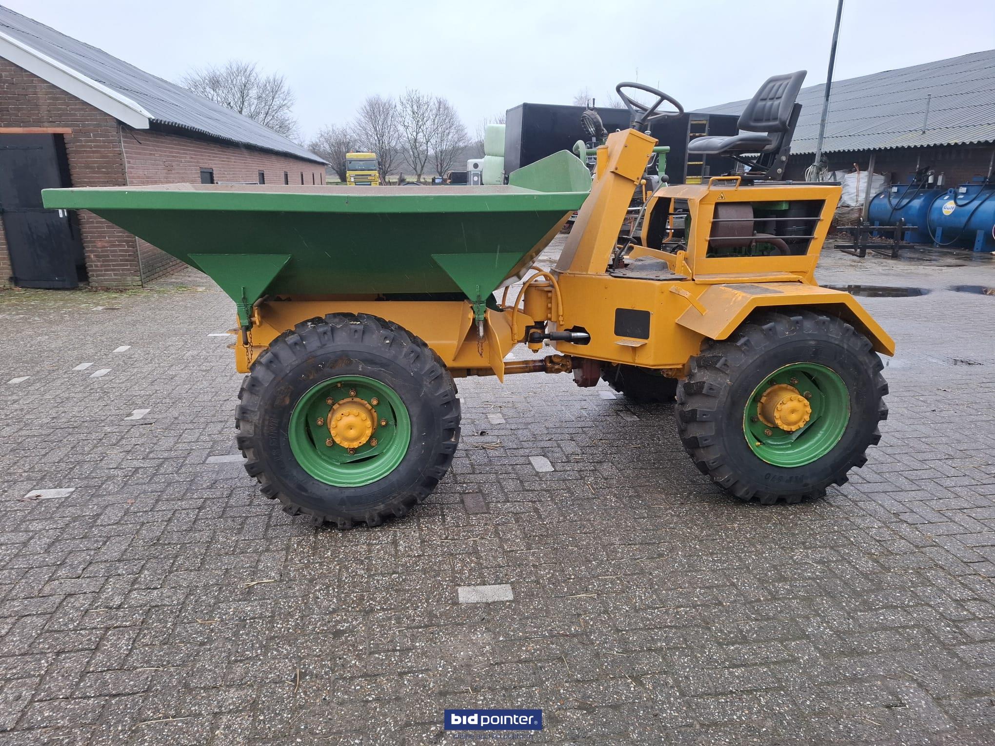 Bergmann knikdumper, inhoud bak 2 M³, 3 zijdige kiepbak, bouwjaar onbekend, 2 cilinder Deutz motor, nieuwe banden, handgeschakeld, goed werkend.