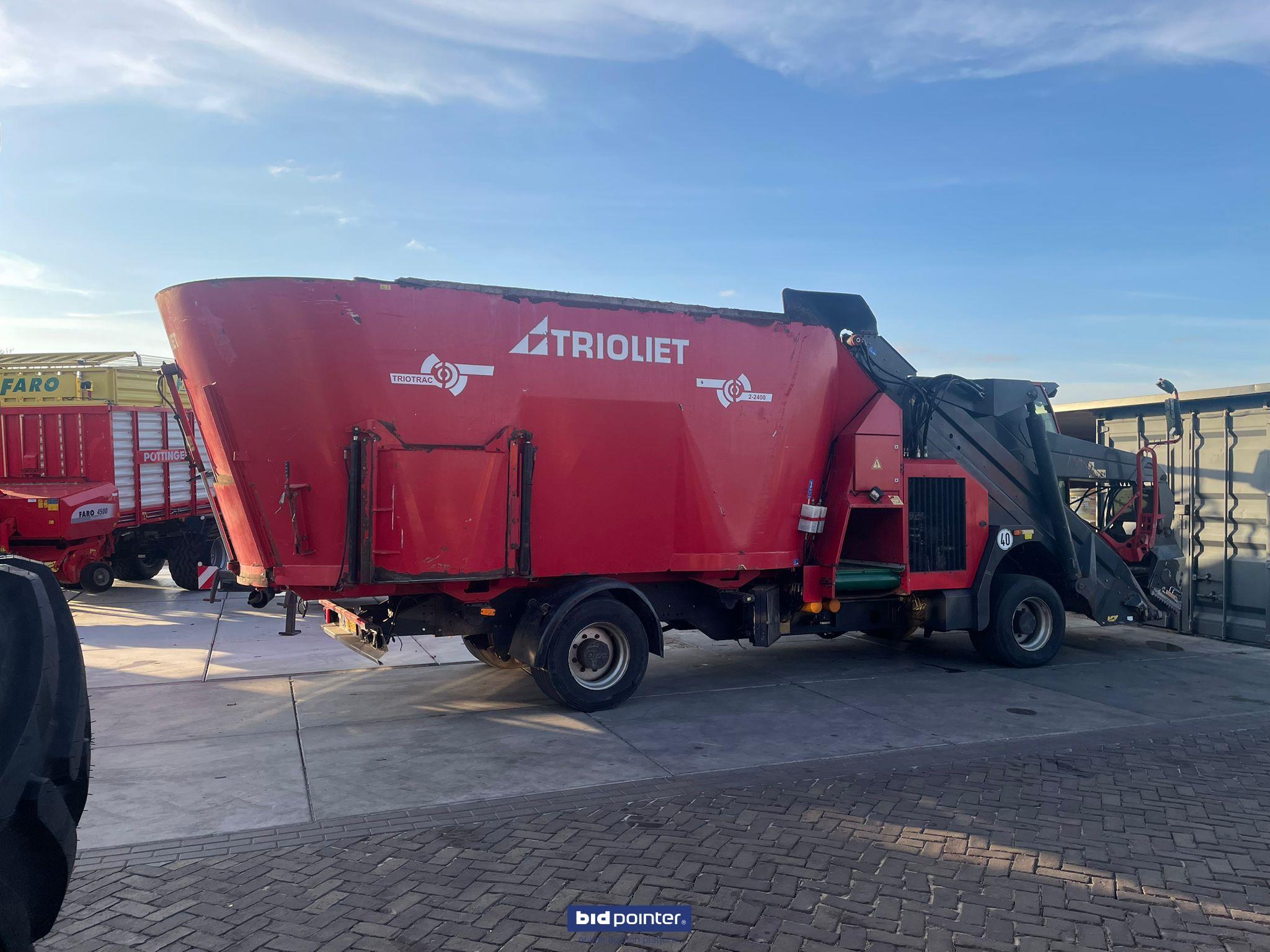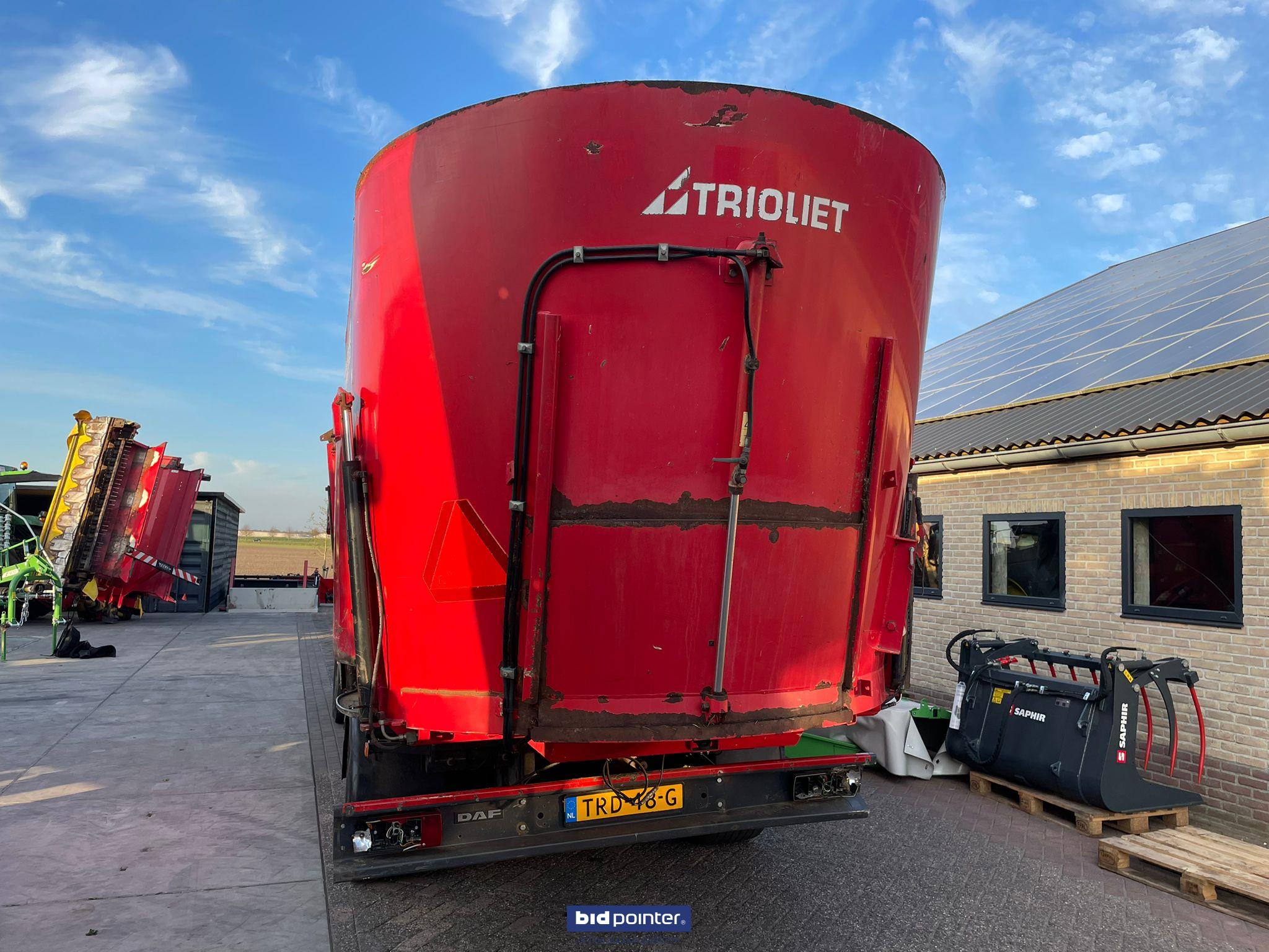 EN: Used Trioliet self-propelled feed mixer with a capacity of 24m3. The Triotrac has 4-wheel steering and a weighing device. It has a discharge chute at the front of the hopper and discharge doors on the left, right, and rear of the wagon. It also has a moving blade. Has a Dutch registration number.
