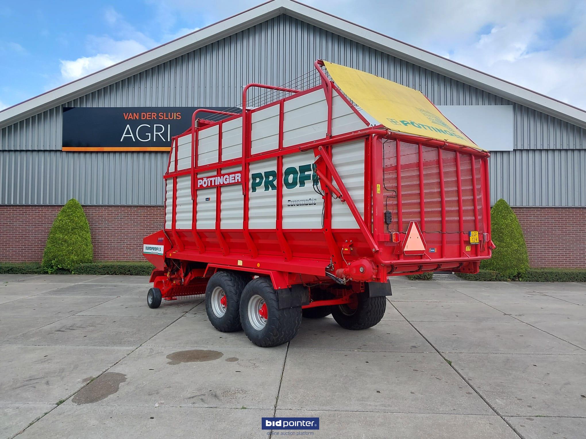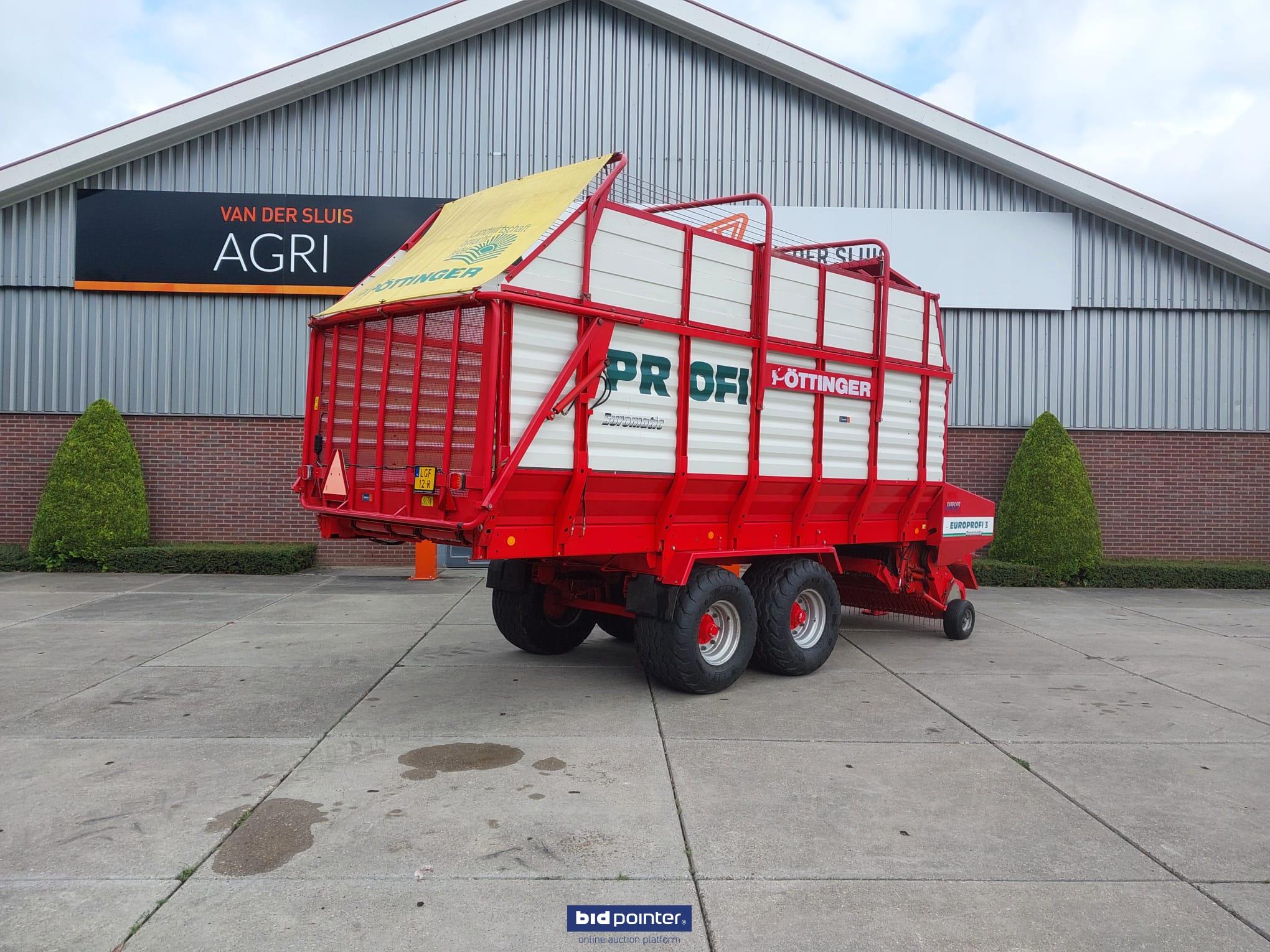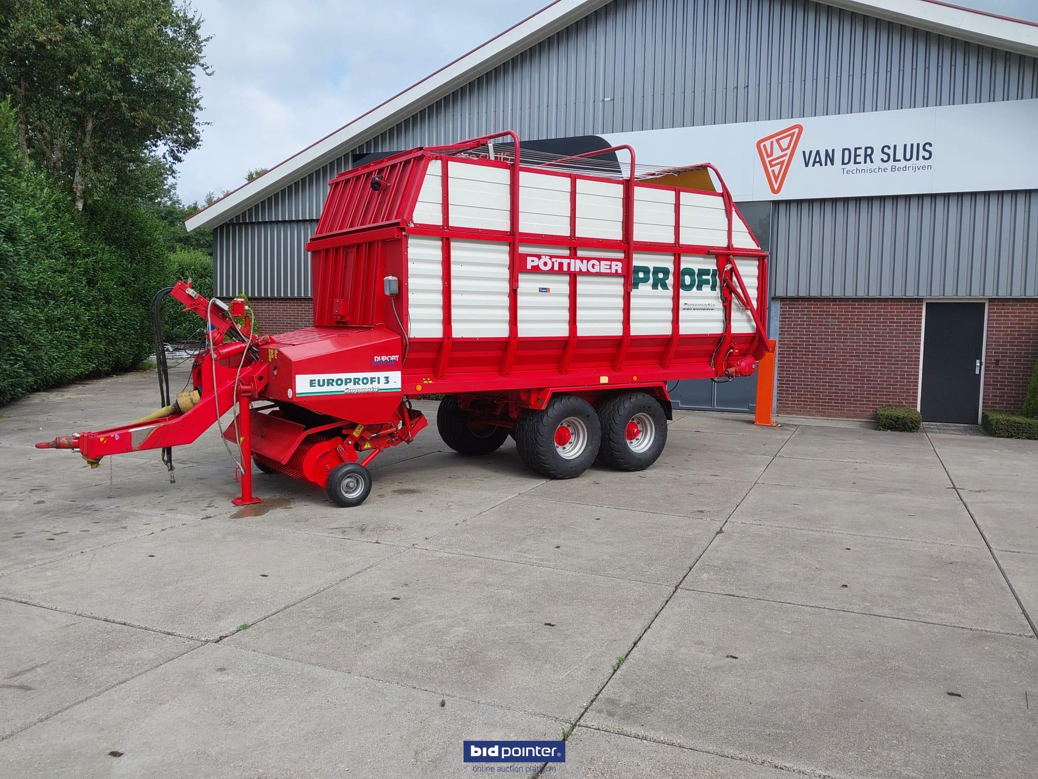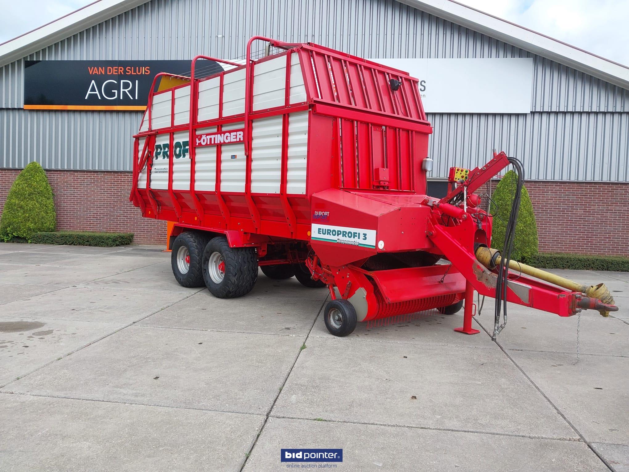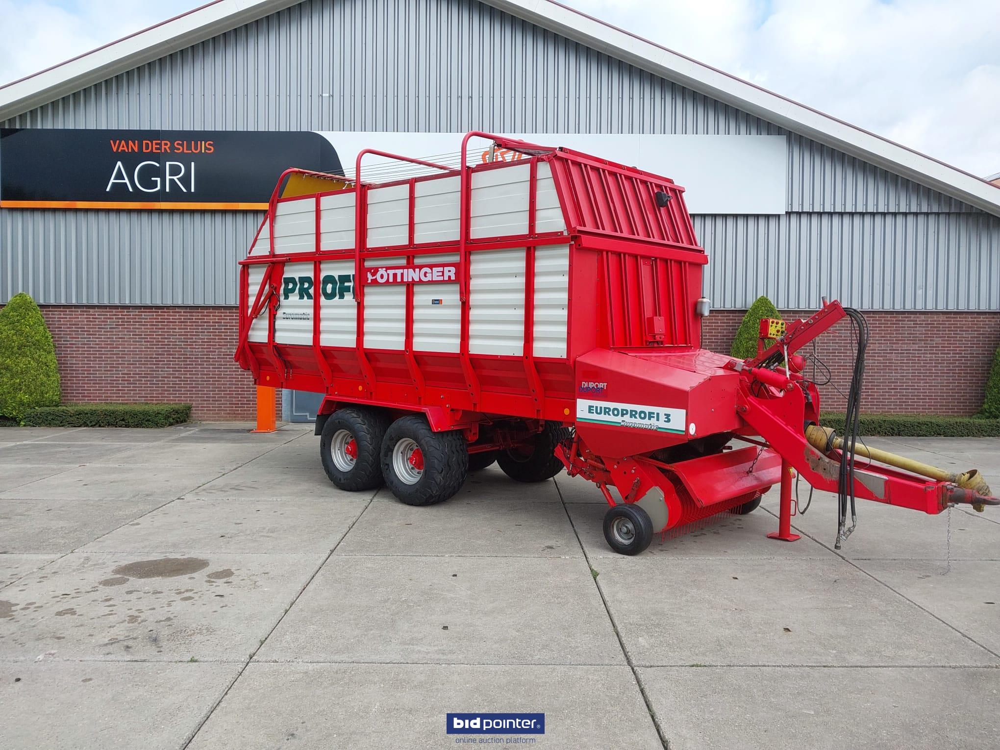 Pöttinger Europrofi 3 forage wagon, year 2001, 32 m³ capacity. Tandem axle with 500/50-17 tyres, rotor intake and chopping unit. Braked and sprung axles, hydraulic adjustable drawbar and electric/hydraulic controls. Fitted with new pick-up. Fully checked and ready for work.