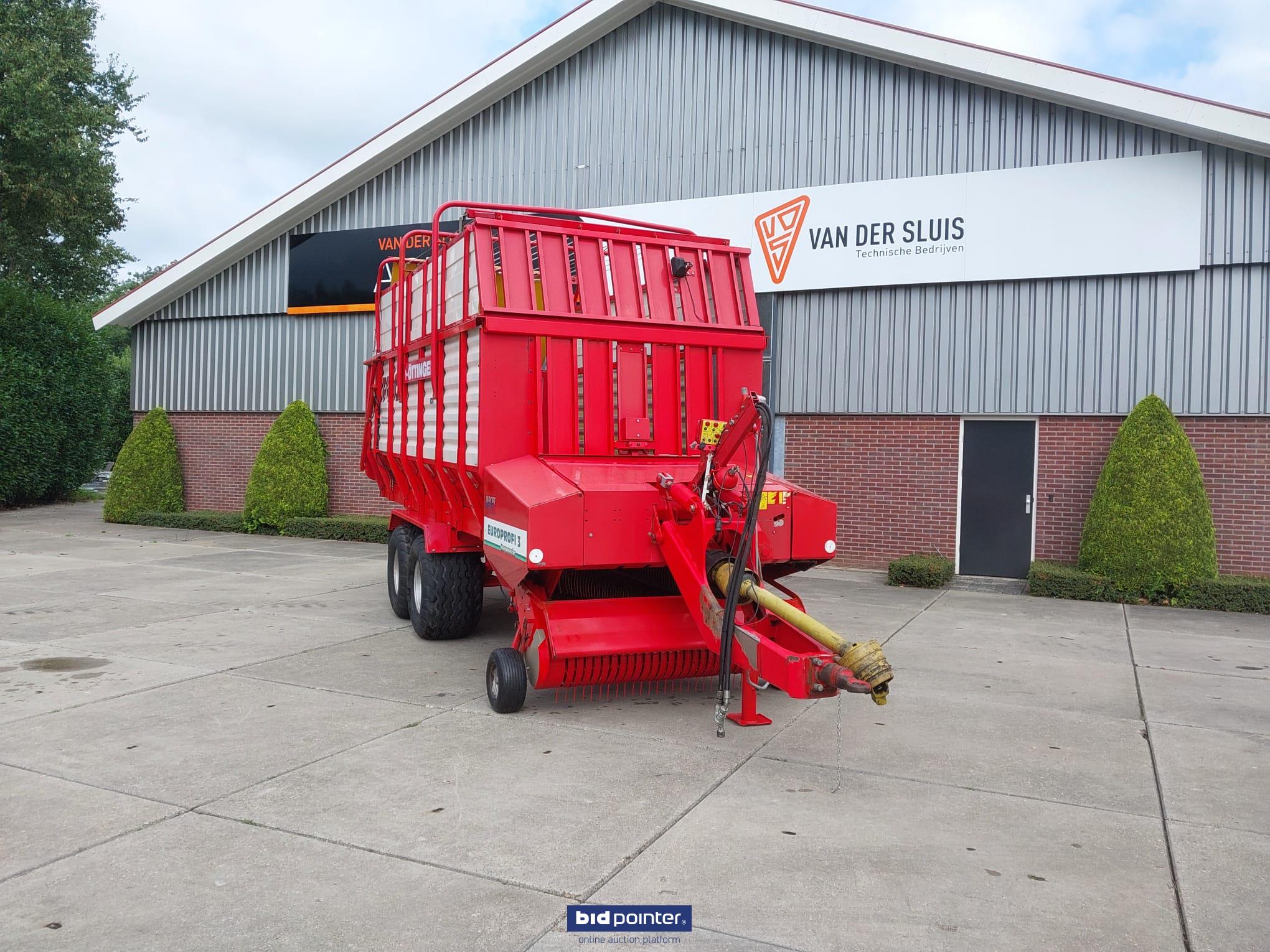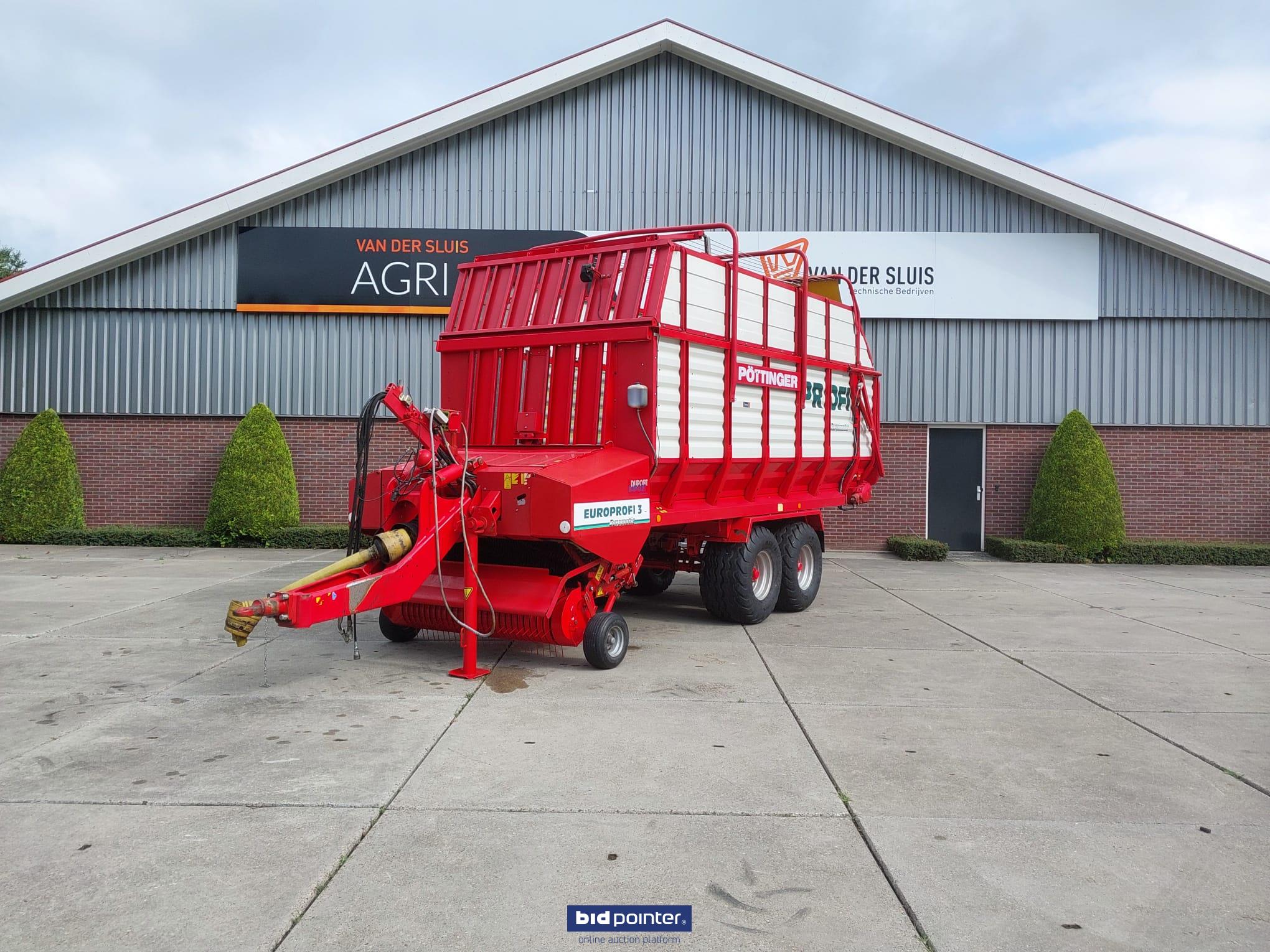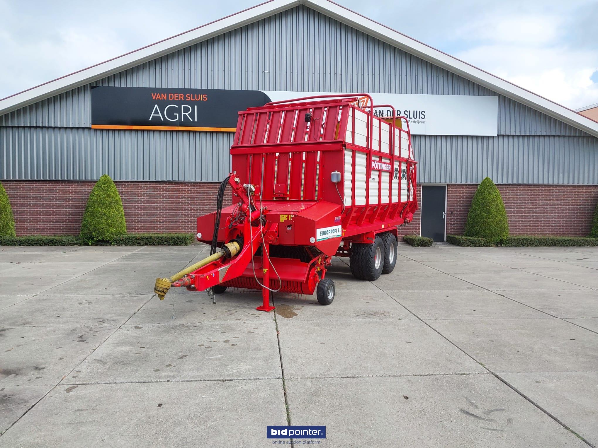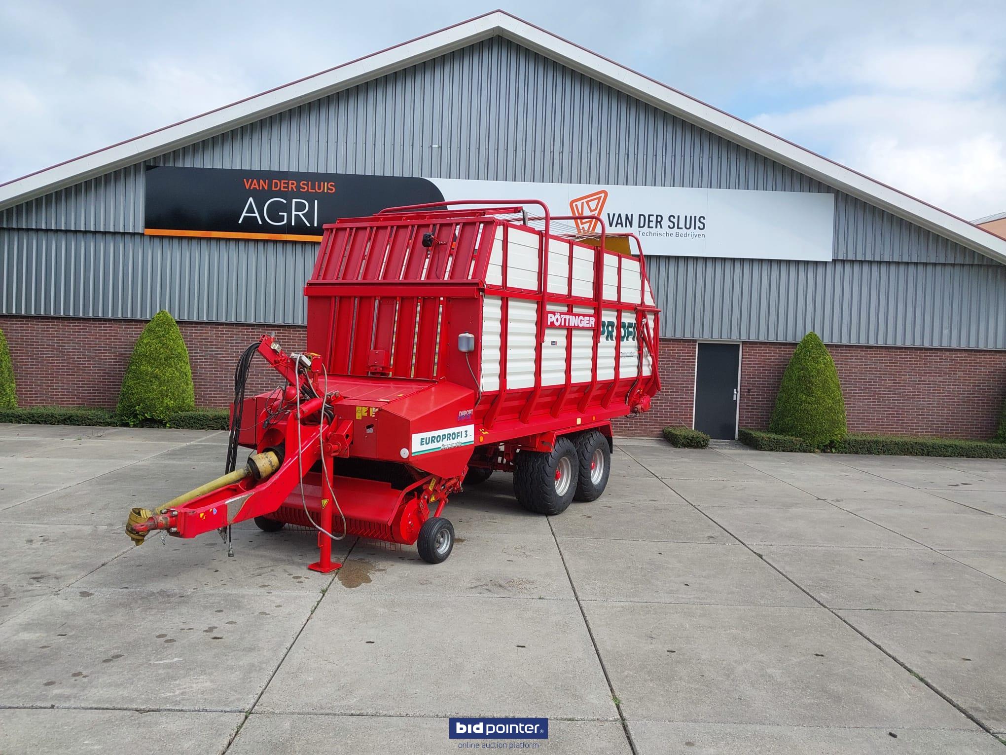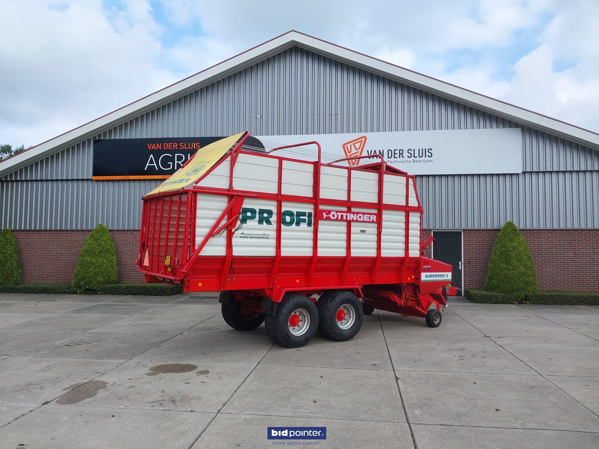 Pöttinger Europrofi 3 forage wagon, year 2001, 32 m³ capacity. Tandem axle with 500/50-17 tyres, rotor intake and chopping unit. Braked and sprung axles, hydraulic adjustable drawbar and electric/hydraulic controls. Fitted with new pick-up. Fully checked and ready for work.