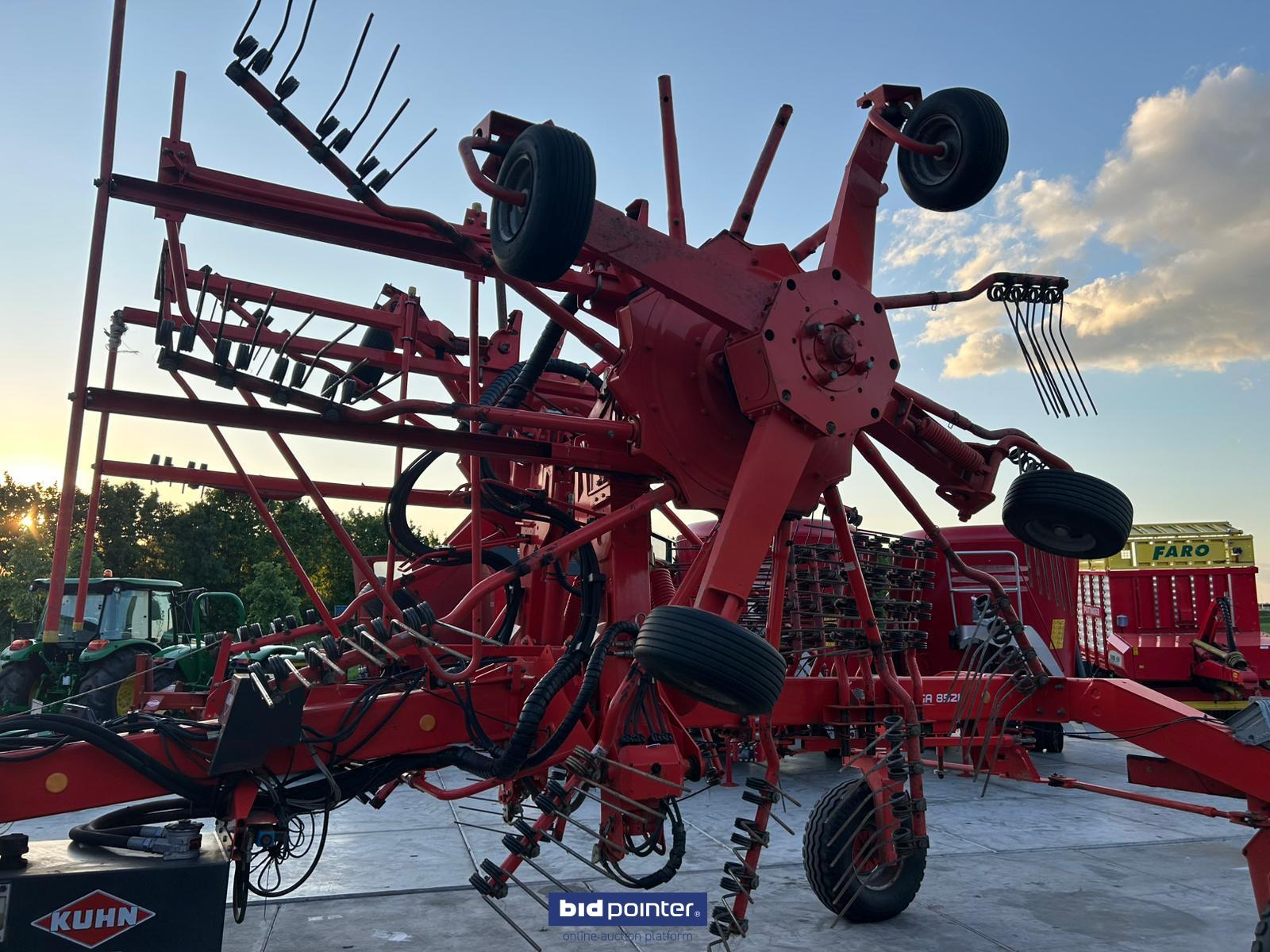 EN: tidy Kuhn 2-rotor rake with center discharge. The rake has a working width of 8.50 meters. It is hydraulically driven and equipped with hydraulic height and working width adjustment. With Dutch registration.