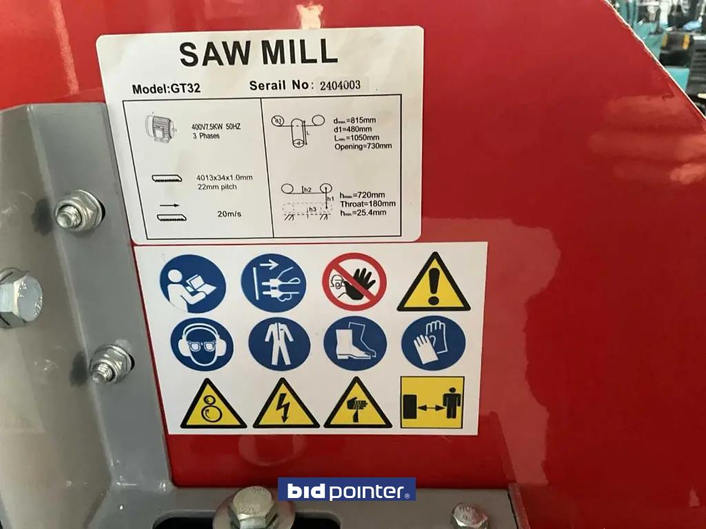 Zaagmachine, GT32, horizontale planken bomenzaag, max. zaagbreedte 800 mm; max. zaaghoogte 720 mm; 7500W; geleverd in houten transport krat transportmaat krat (LxBxH): 2280mm x 650mm x 860mm; 380 volt aansluiting; koelvloeistof tank; noodstop; gewicht ca. 392 kg; handleiding aanwezig.