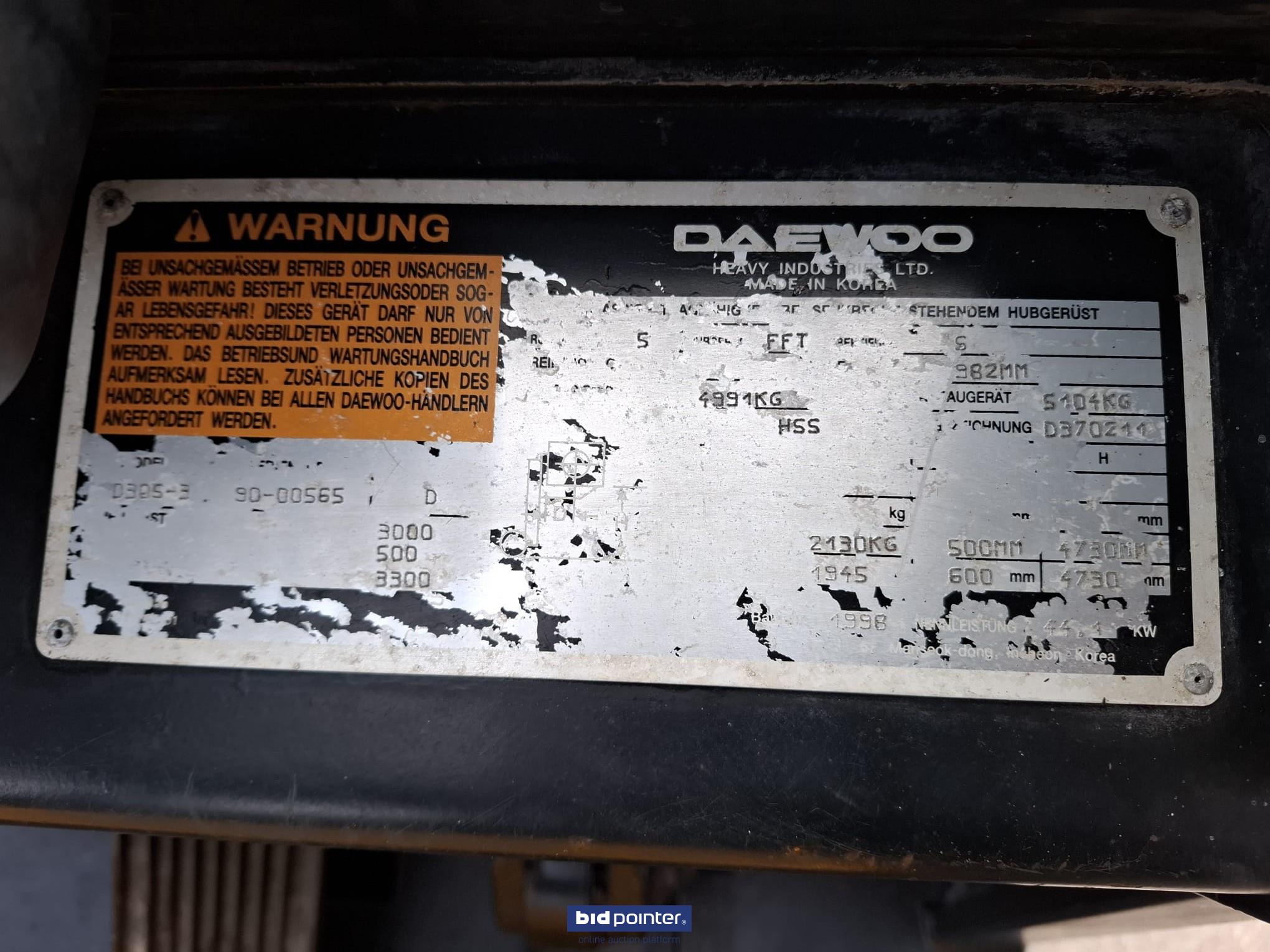 EN: Daewoo D305-3, year of construction 1998, engine power 44.4 kW/60 hp, lift height 3.30 meters, side shift, 2-piece mast, nice forklift truck.