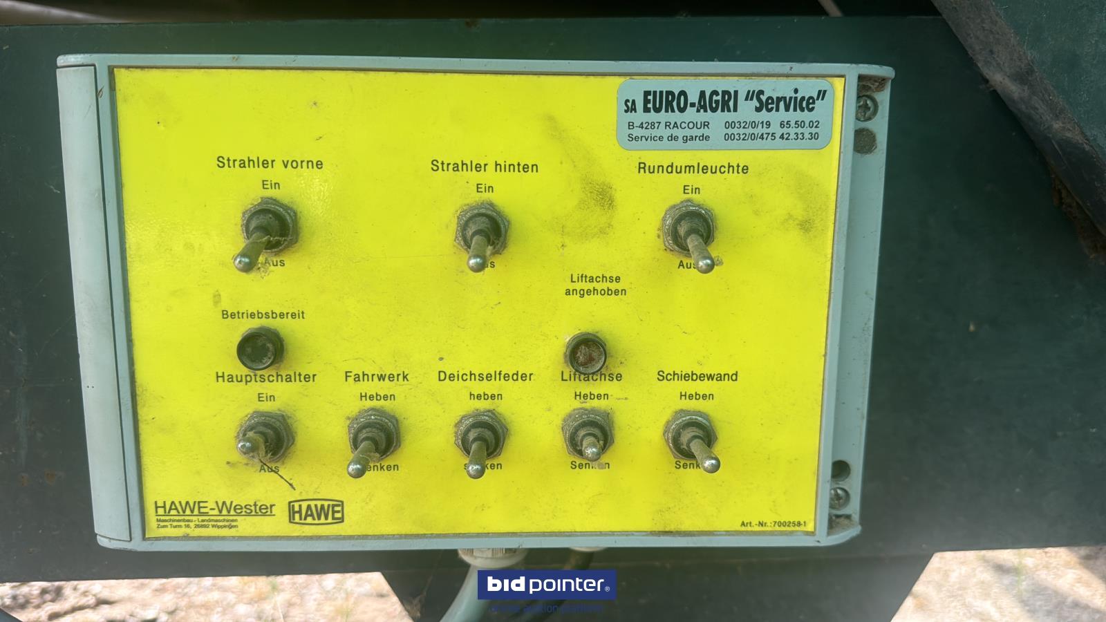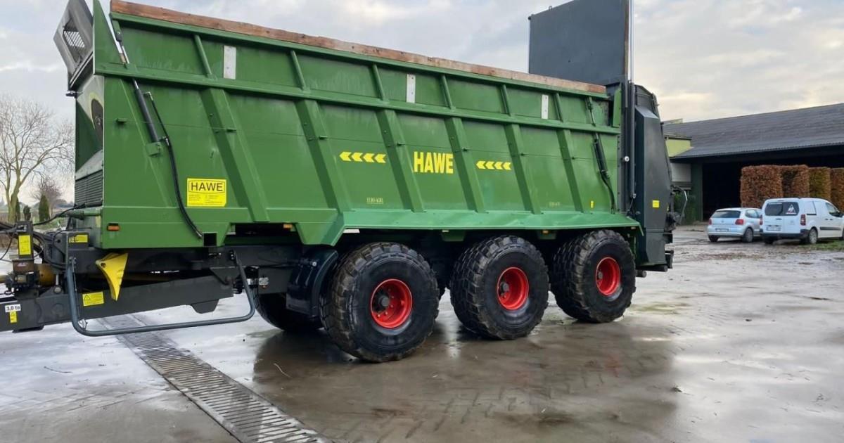 NL: HAWE Universeel Breedstrooier, 3-As Hydraulisch geveerd met liftas, Electro Hydr gestuurd, Hydr. geveerde trekdissel, Vlakke bodemketting HV125, 3 Freeswalsen, Opzetschotten eenzijde hydr. hoogte verstelbaar, Autom Centrale vetsmering, Electro Hydr bediening, Iso-Bus afgiftecomputer, Banden 24R20,5 Michelin XS, Hydr. Grensstrooier. Bouwjaar 2014 UK: HAWE Universal Spreader, 3-As Hydraulically suspended with lift axle, Electro Hydr steered, Hydr. suspended drawbar, Flat bottom chain HV125, 3 Milling beaters, Attachments one side hydr. height adjustable, Autom Central grease lubrication, Electro Hydr control, Iso-Bus dispense computer, Tyres 24R20.5 Michelin XS, Hydr. border spreader. Year built 2014 DE: HAWE Universalstreuer, 3-As hydraulisch aufgehängt mit Liftachse, elektro-hydr. gelenkt, hydr. aufgehängte Deichsel, Flachbodenkette HV125, 3 Fräswalzen, Anbaugeräte einseitig hydr. höhenverstellbar, Autom. Zentralschmierung, elektro-hydr. Steuerung, Iso-Bus Dosiercomputer, Bereifung 24R20.5 Michelin XS, hydr. Grenzstreuer. Baujahr 2014