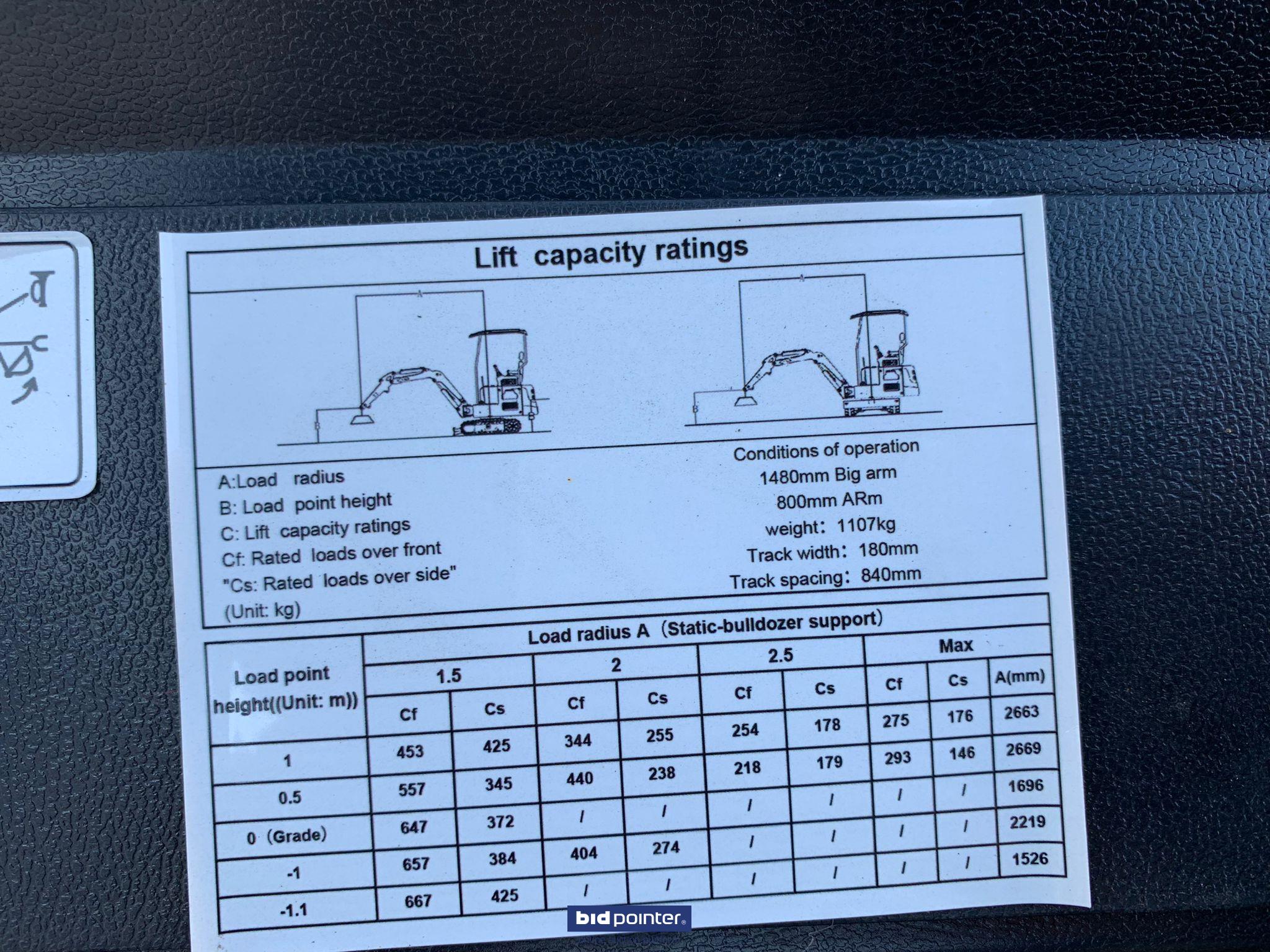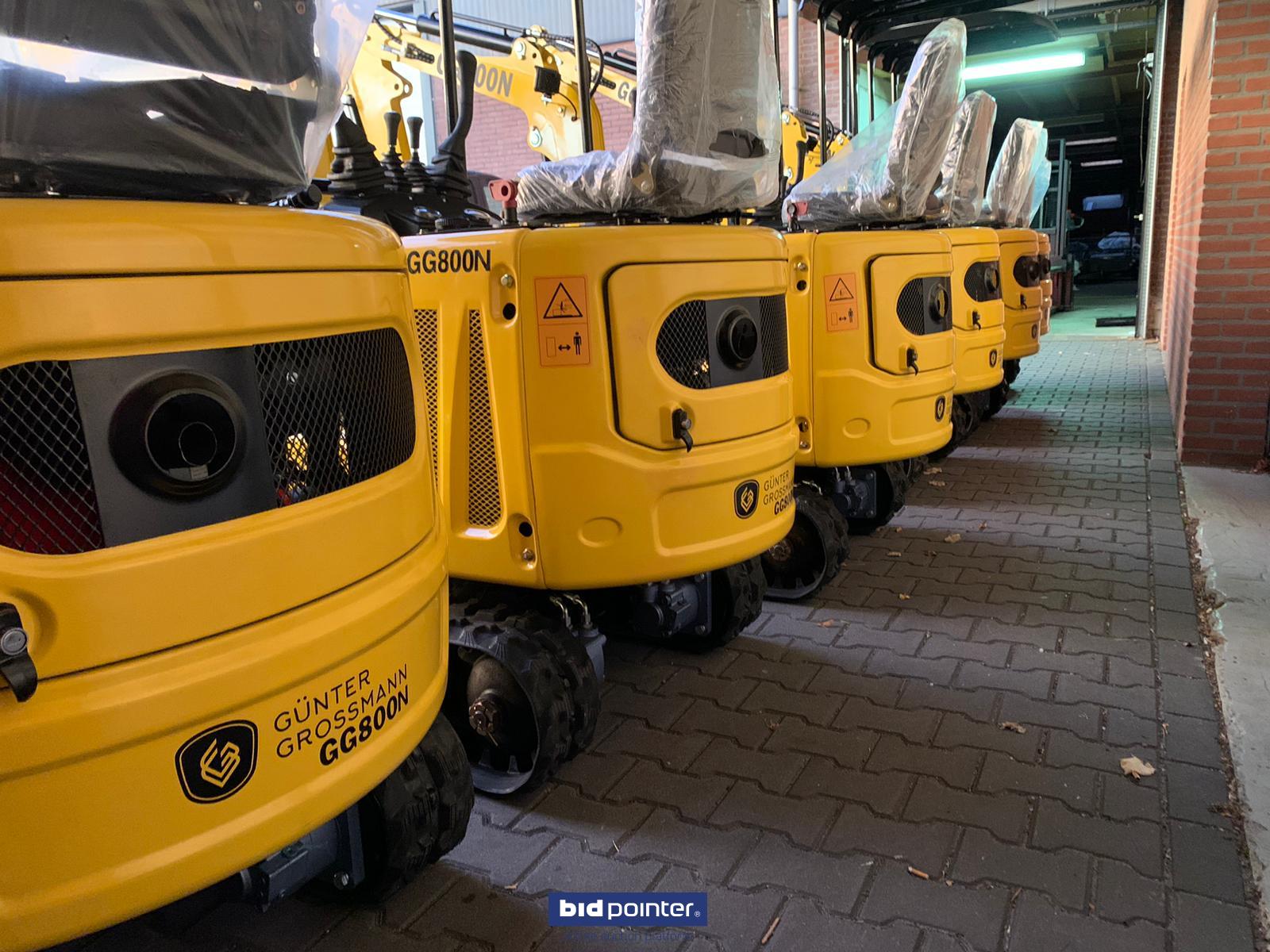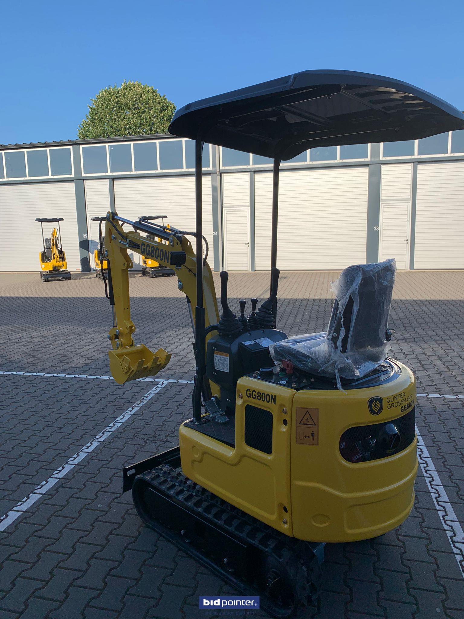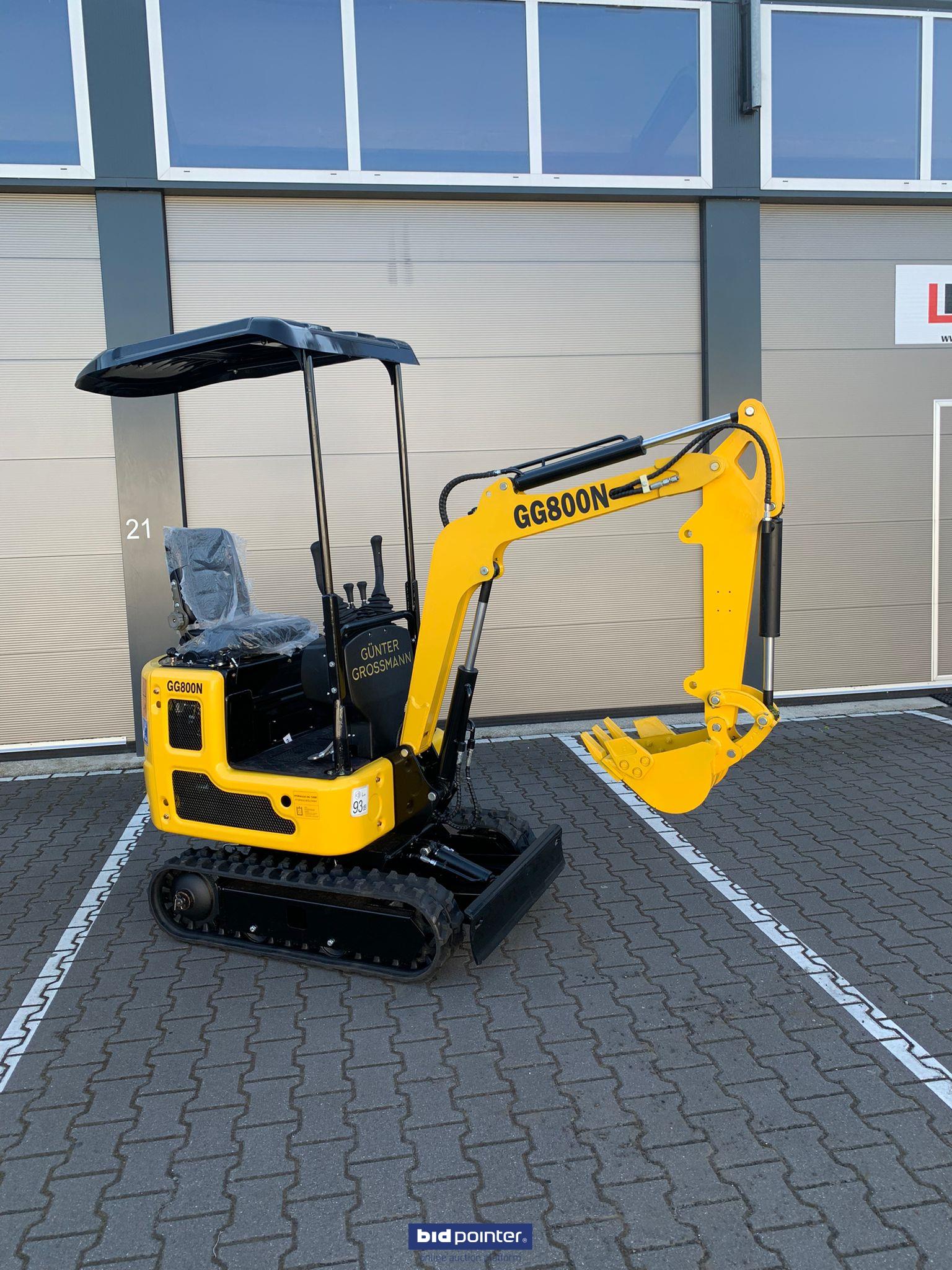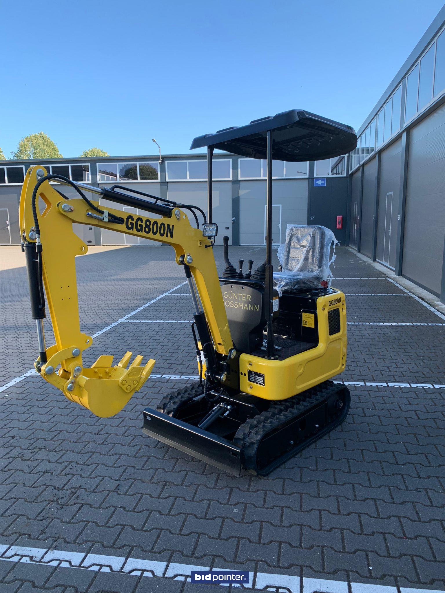 Overall dimensions (LxWxH): 2770x930x1490 mm Total track length: 1230 mm Chassis width: 896 mm Track width: 200 mm Ground clearance chassis: 132 mm Track height: 320 mm WORKING RANGE Max. digging depth: 1650 mm Max. digging height: 2610 mm Max. dumping quantity: 1850 mm Max. digging radius on the ground: 2890 mm Rotation radius: 360° Max. Increase the height of the dozer blade: 345 mm Max. Dozer blade digging depth: 255 mm Specification Model: GG800N Brand: Günter Grossmann Working weight: 800 kg Bucket capacity: 0.025 cbm Bucket width: 380 mm Engine: Diesel Gunter Grossmann Euro 5 Nominal power: 8.6 kW/3600 rpm Main pump: Wanye hydraulic Hydraulic pressure: 16 mpa Rotation motor: Dali Travel motor: Dali Travel speed: 1.5 km/h